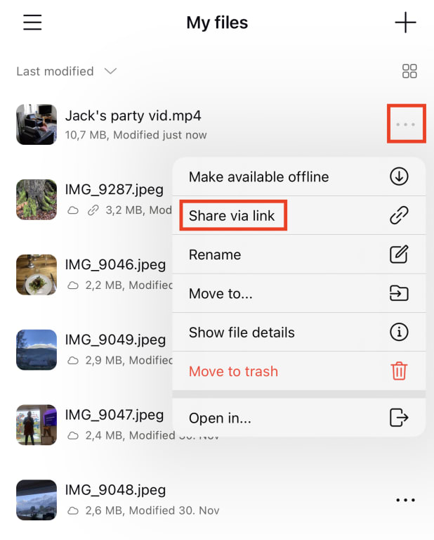 - Once your file has been uploaded, tap the three horizontal dots (…) next to the file and select Share via link.