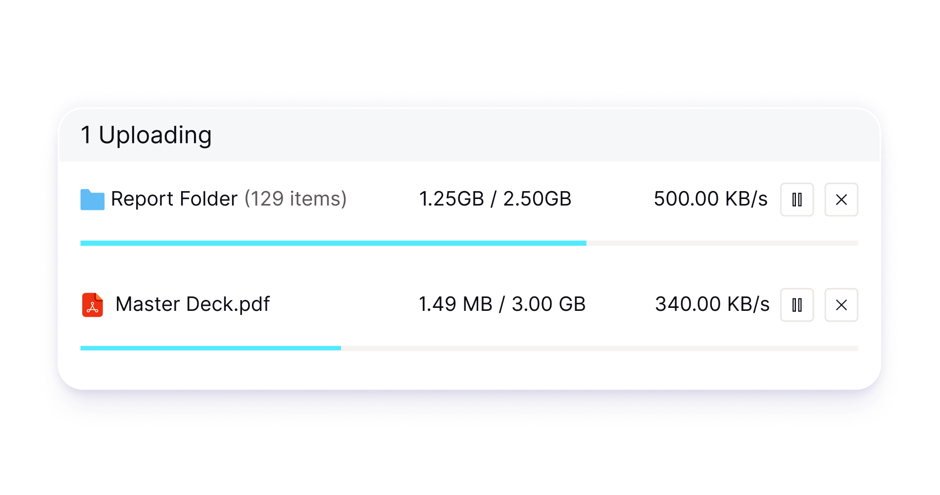 팀용 클라우드 저장공간을 사용하여 제한이나 품질 저하에 대한 걱정 없이 모든 크기의 파일을 업로드, 저장 및 공유하세요.