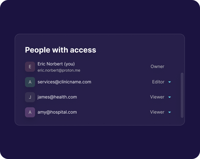 Proton Drive의 종단 간 암호화는 보안 사고 및 무단 접근으로부터 보호 대상 의료 정보(PHI)를 보호하여 귀하가 고품질 진료 제공에 집중할 수 있도록 합니다.