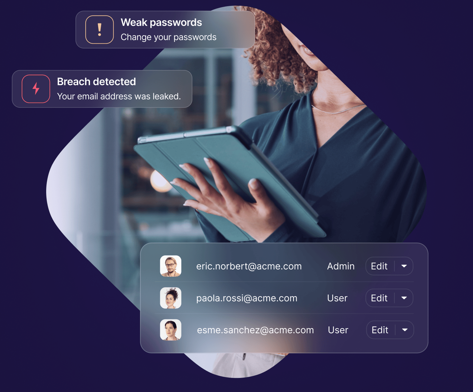 데이터 유출은 비즈니스를 위협합니다. 모든 팀원이 데이터 유출을 방지하고 종단간 암호화되고 사용하기 쉬운 비밀번호 관리자로 비즈니스 데이터를 보호하도록 도우세요.