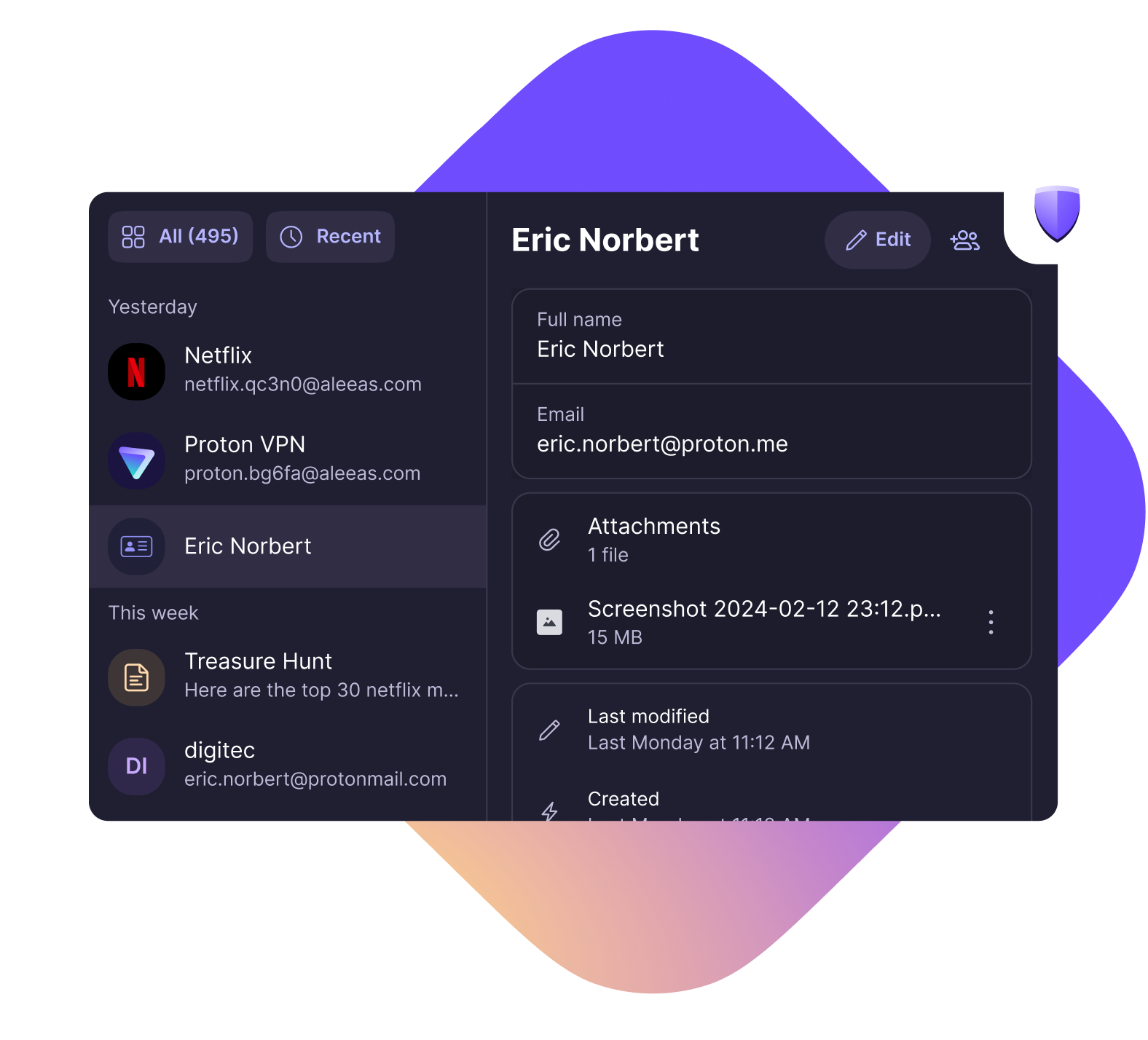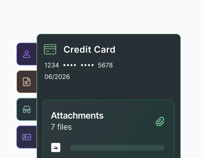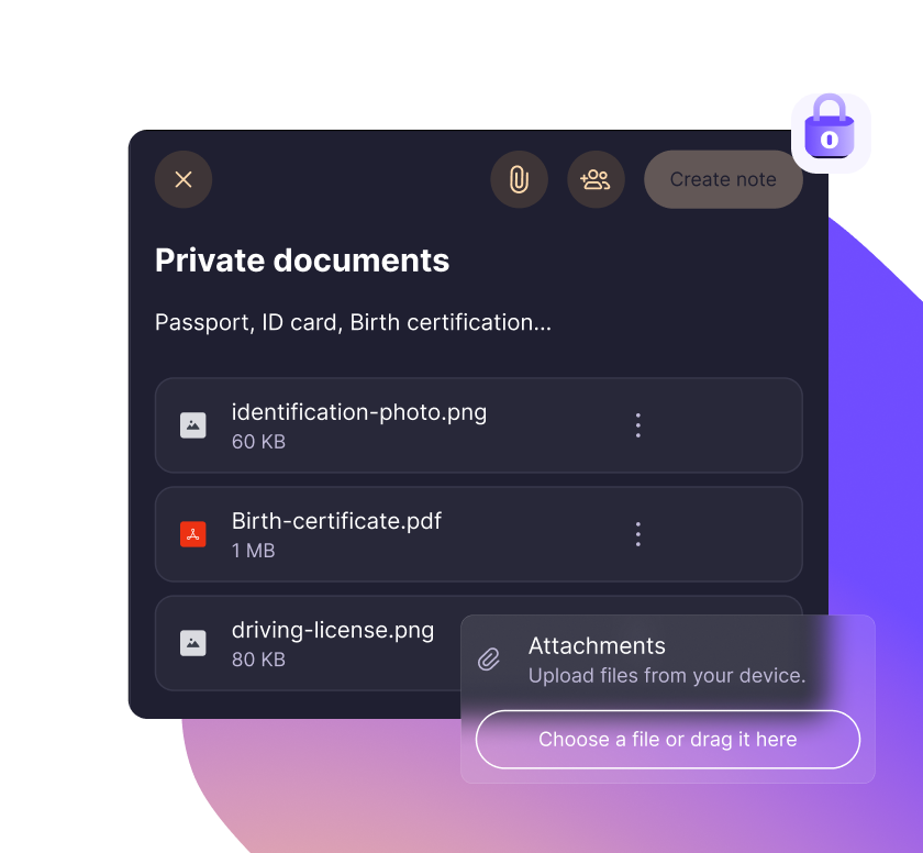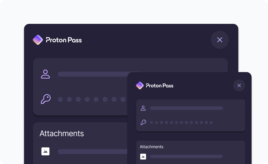 Proton Pass를 사용하면 디지털 생활을 간단하게 정리하고 간소화할 수 있습니다. Proton Pass에서 비밀번호, 신원 또는 노트를 만들 때 파일을 첨부하여 특정 계정에 대한 모든 관련 정보를 하나의 안전한 장소에 저장할 수 있습니다.