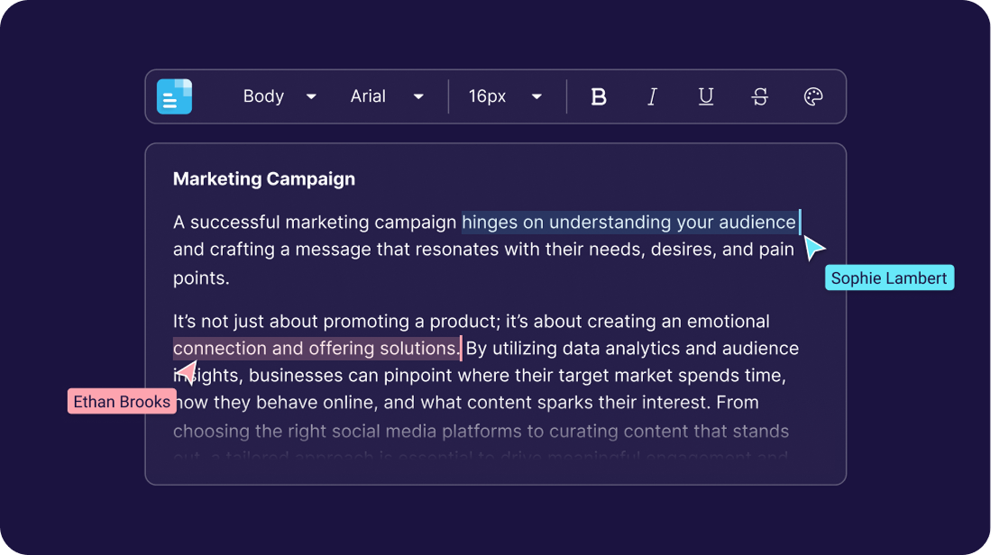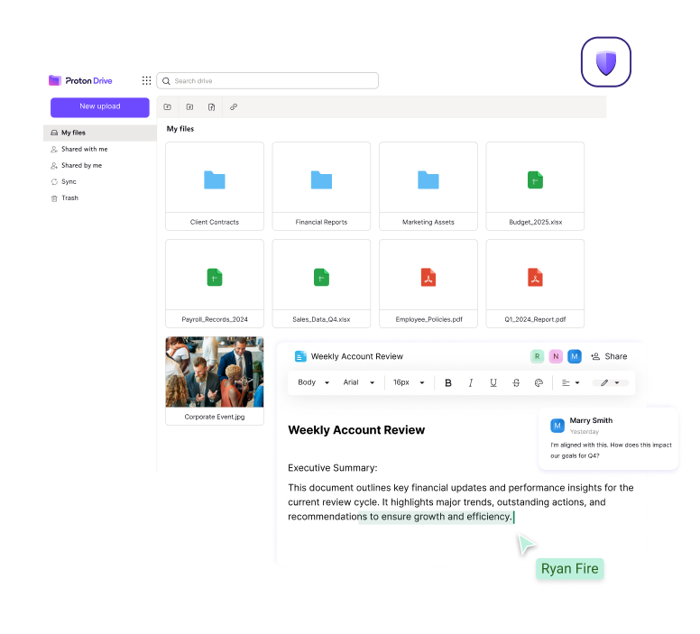 Manage folders with others in real-time or create and collaborate on secure documents with Docs in Proton Drive. All changes sync instantly, ensuring team and client alignment across geographies and time zones — whether refining contracts or finalizing project plans.