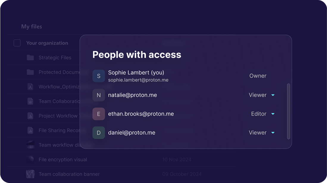 With end-to-end encryption, your files are completely inaccessible to anyone, including Proton. When you do want to share them, you stay in control: set passwords, expiration dates, or revoke access instantly — even if the recipient doesn’t have a Proton account.