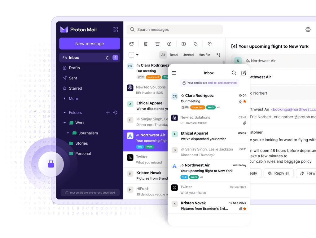 Proton Mail is truly free - no ads, hidden costs, or data harvesting. Choose the world's leading end-to-end encrypted email provider, recommended by privacy experts and millions of people like you. That's because your emails and the contents belong to you — not even Proton can read your messages. Your free email comes with all the organization and productivity features you would expect, minus the data tracking and advertising.