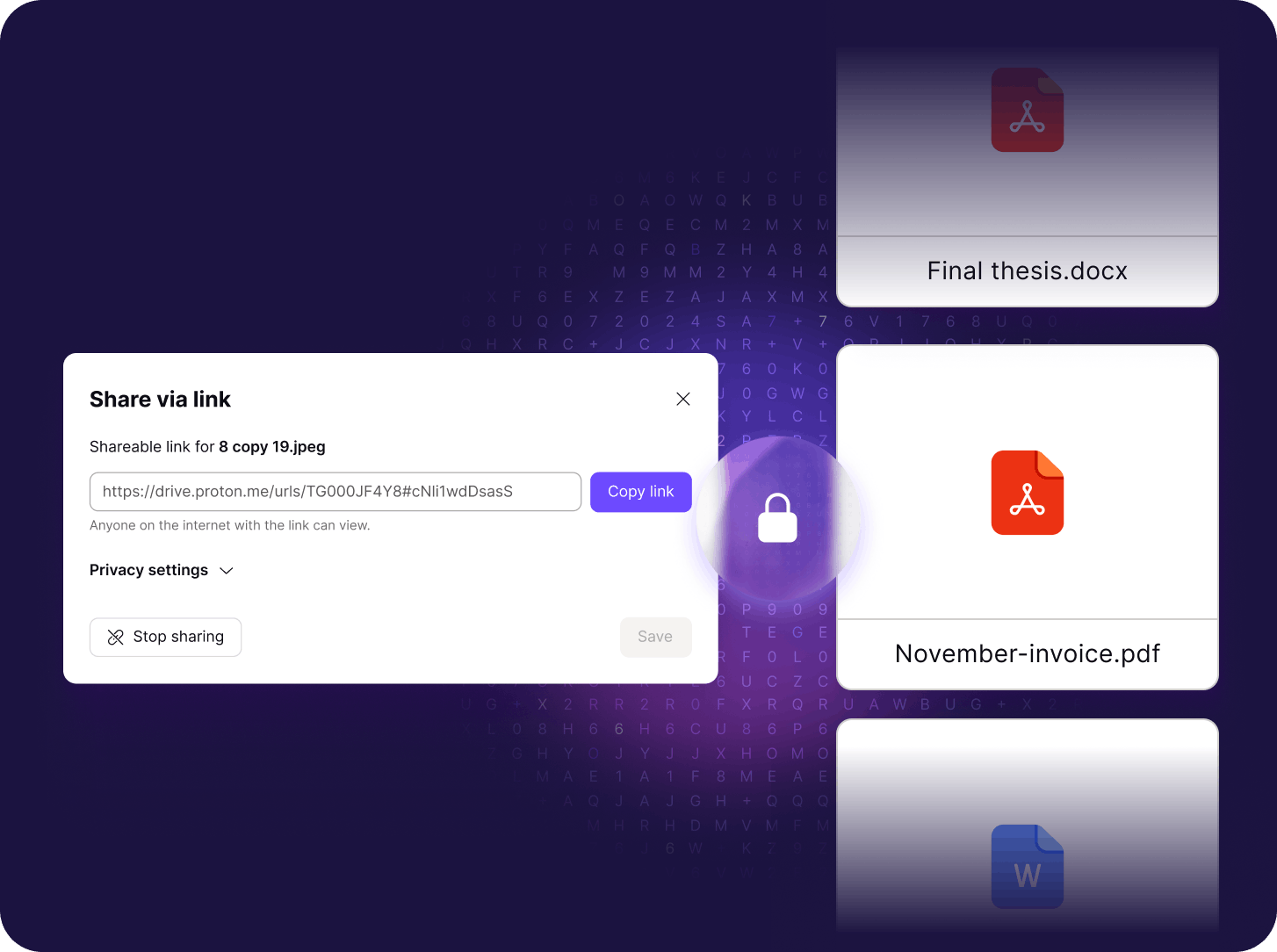 Your IP address is never exposed to the recipients of the files you share with Proton Drive, helping keep your personal information private.