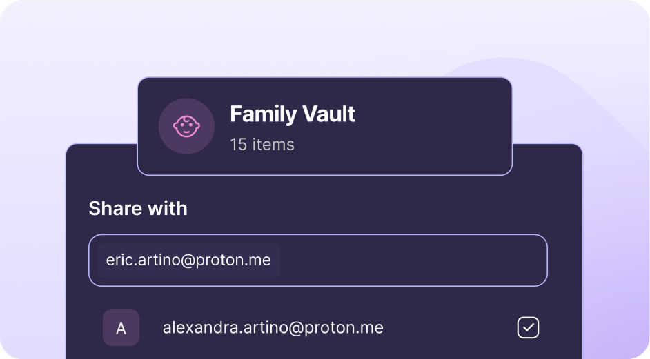 Easily share sensitive information with anyone, even if they don’t use Proton Pass. You can share single items such as passwords, notes or credit cards or a full vault.