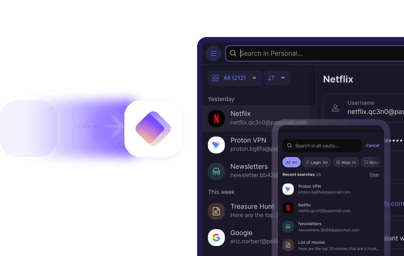 Besides storing your logins, Proton Pass protects your identity with an integrated email alias feature.