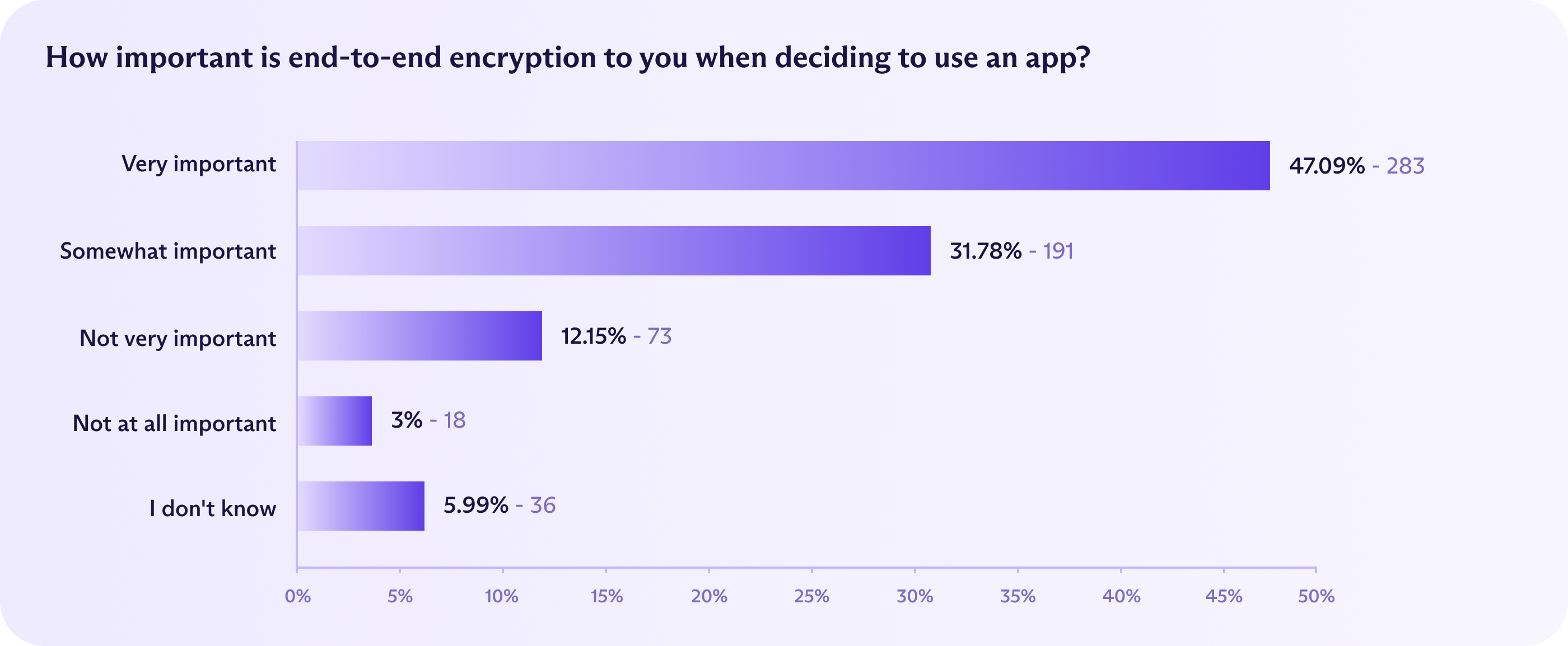 Roughly 47% of people in Germany think end-to-end encryption (E2EE) is a “very important” factor when choosing an app. An additional 31% say it is “somewhat important,” meaning roughly 8 out of 10 Germans (78%) value E2EE, one of the strongest forms of digital privacy protection. Germans also have a solid understanding of how the technology works, with 68% of people who know the term correctly identifying that only the sender and recipient can read E2EE messages.
