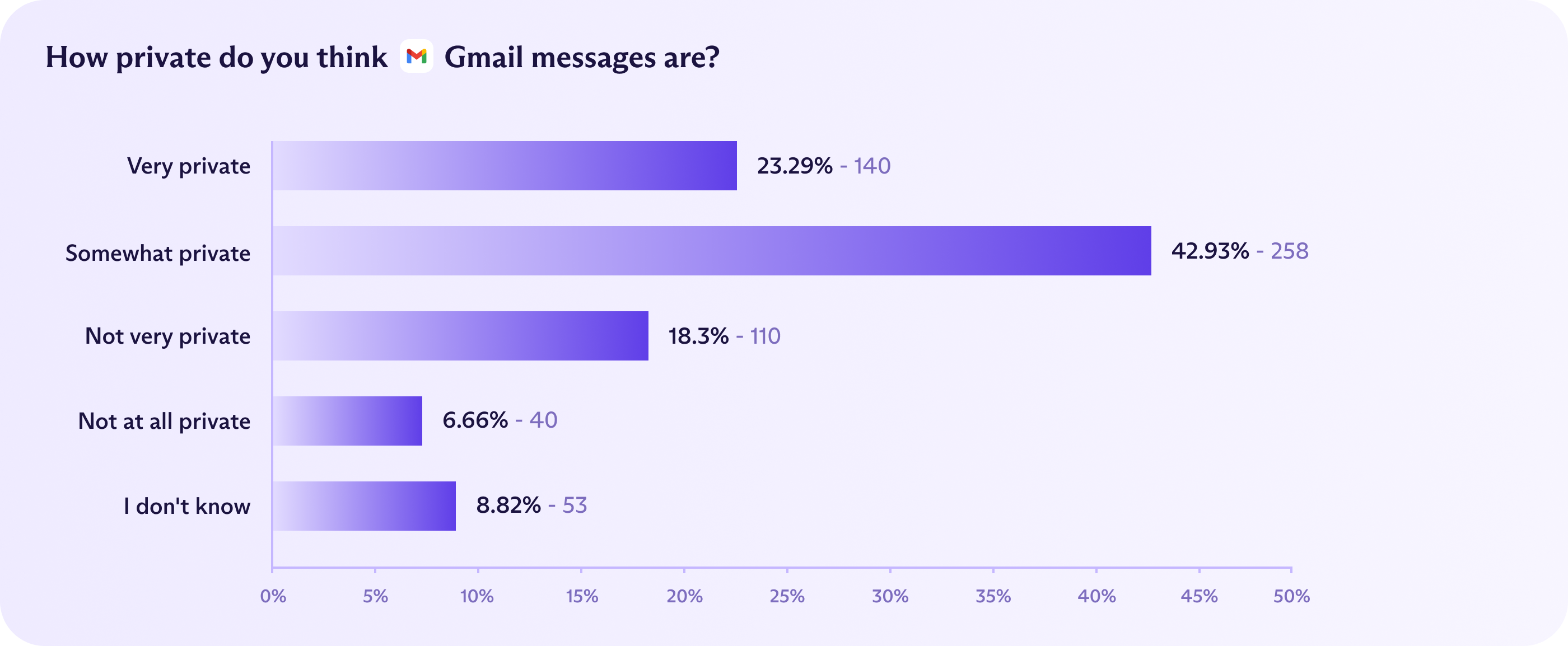 In fact, Germans were the most comfortable with Gmail’s privacy protections. Overall, 66% of Germans believe their Gmail messages were “very” or “somewhat private” — the highest trust level among surveyed countries, followed by the US at 61% and the UK at 57%. Ironically, the country that puts the least faith in E2EE, France, also has the least trust in Gmail, with only 48% of French respondents saying their messages were at least somewhat private.
