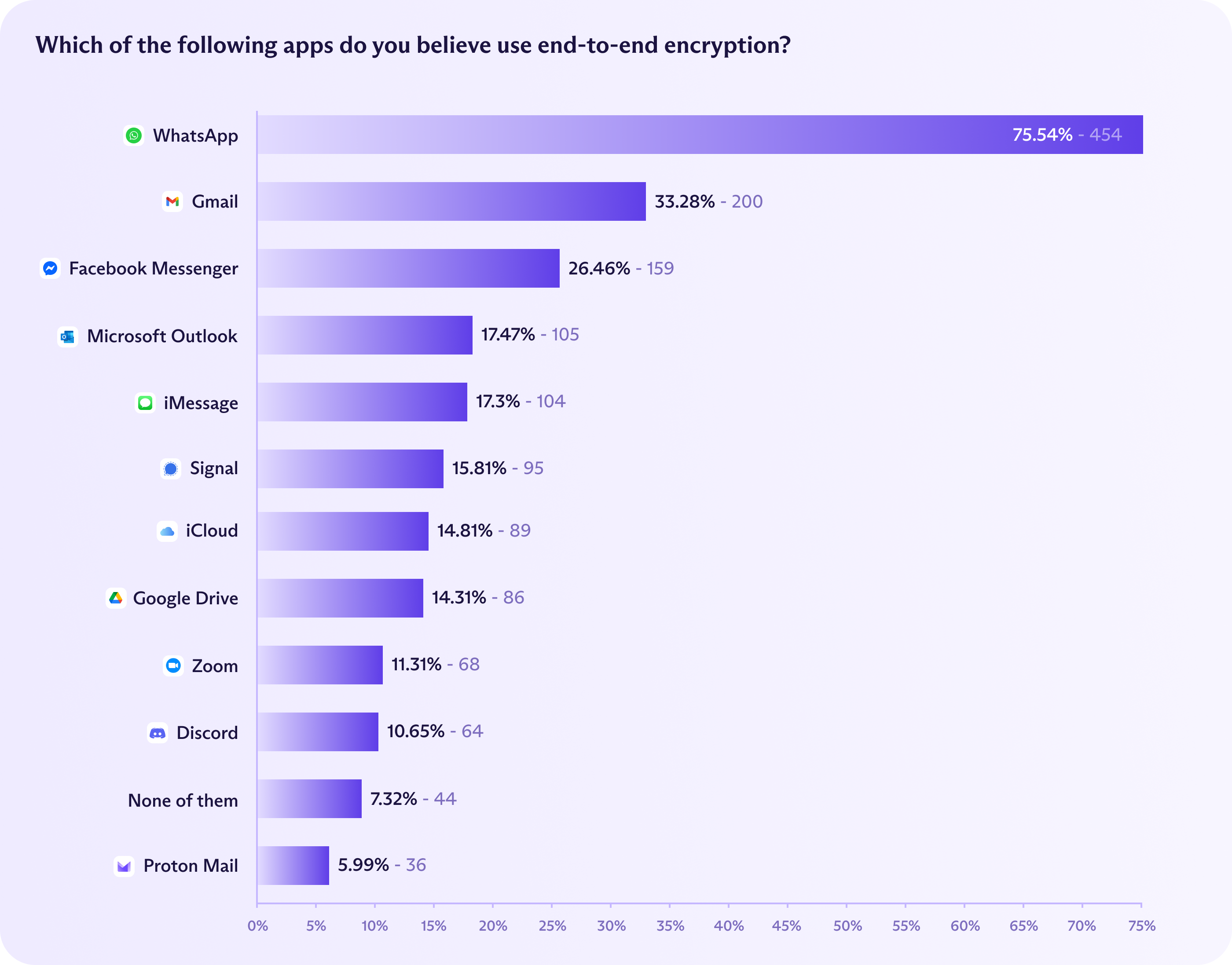 However, despite understanding what E2EE does, many Germans remain unclear about which services offer it. One in three respondents (33%) incorrectly believe Gmail offers E2EE, and 17% incorrectly believe Microsoft Outlook does (see graph below).