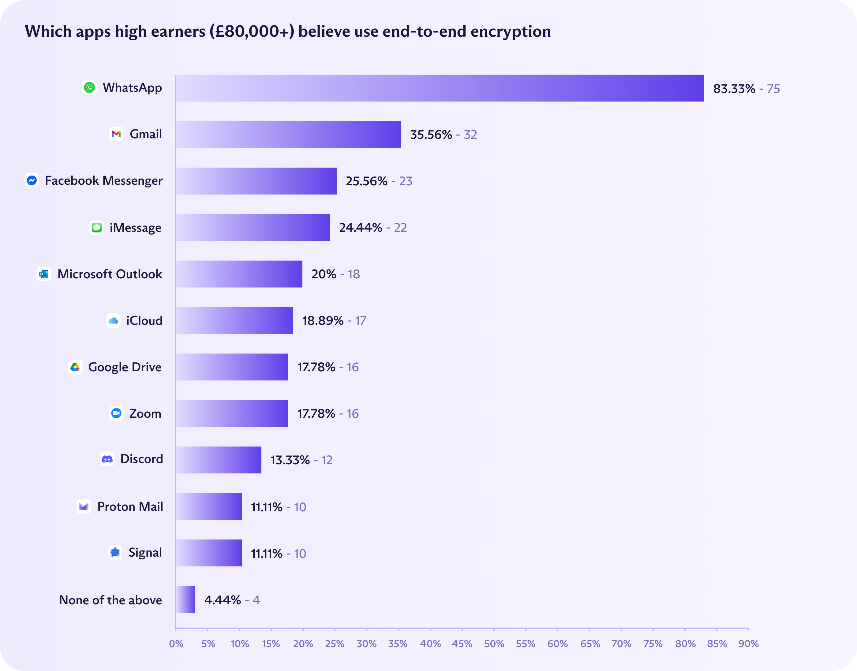 Survey respondents were far more likely to trust and use familiar platforms than those purpose-built for privacy. Only 10% of Brits recognized that Signal, one of the most secure messaging apps available, offered E2EE. Proton Mail fared even worse, at just 9%.