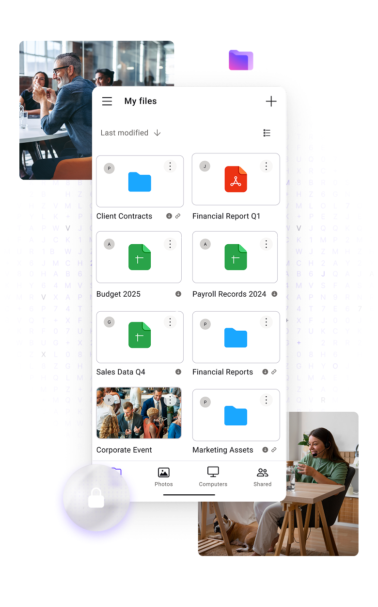 Blijf productief, waar uw werk u ook brengt, en krijg toegang tot bestanden via uw browser, desktop of smartphone. Of u nu op kantoor bent, onderweg of op afstand werkt, met cloudopslag voor Business houdt u uw bestanden binnen handbereik.