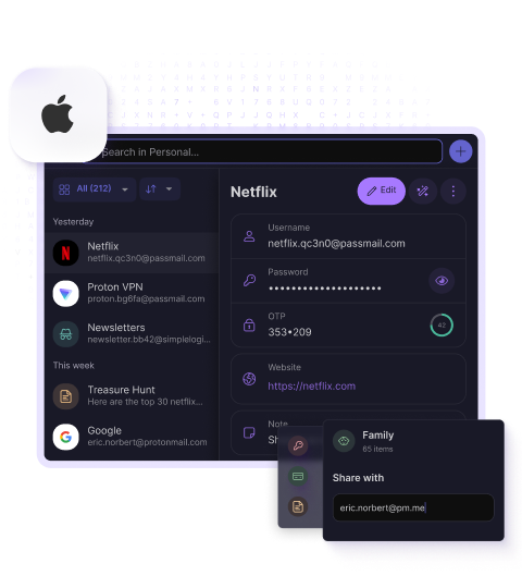 Met Proton Pass kunt u wachtwoorden, creditcards of notities veilig delen met familie, vrienden of collega's, zelfs als zij deze Mac wachtwoordmanager niet gebruiken. U kunt individuele items delen via end-to-end versleutelde koppelingen, of toegang verlenen tot een kluis met meerdere items door e-mailadressen op te geven. Bovendien kunt u vervaldatums instellen, weergaven beperken, de toegangscontrole beheren en op elk moment de toegang intrekken.