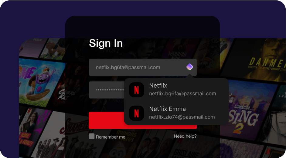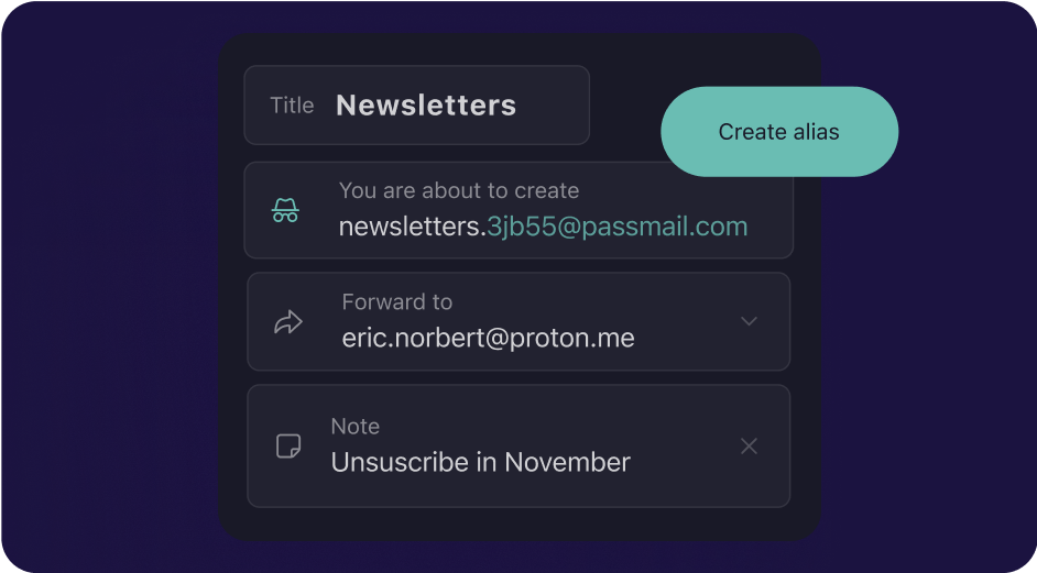 Besides storing your logins, Proton Pass protects your identity with an integrated email alias feature. Whenever you sign up for a new online account, Proton Pass can automatically create an alias to keep your actual email address protected.
