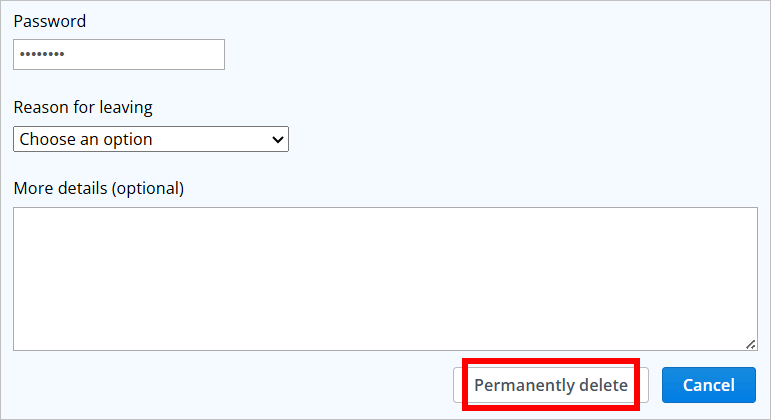 - Enter your password, select a reason for leaving, and click Permanently delete.