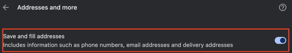 - To turn autofill for payment methods or addresses on or off, select Save and fill payment methods or Save and fill addresses.
