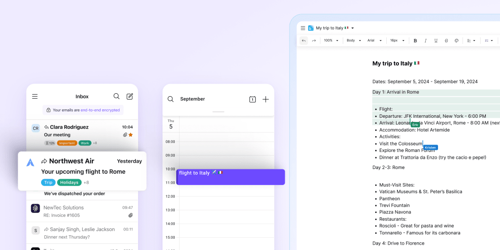 - Share your calendar: Keep track of schedules and plan events and vacations with a shared Proton Calendar.