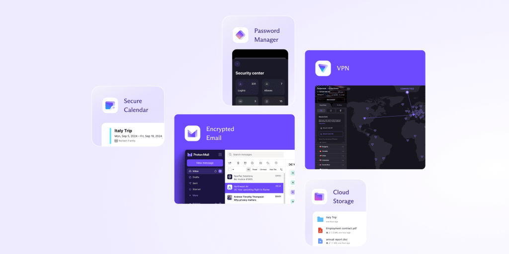 Proton makes online privacy easy. Our apps use end-to-end and zero-access encryption, meaning that no one — not even Proton — can access you or your partner’s information without your explicit permission. Encryption works automatically in the background, so you can send emails, plan your day, or share files as usual while we handle the rest.