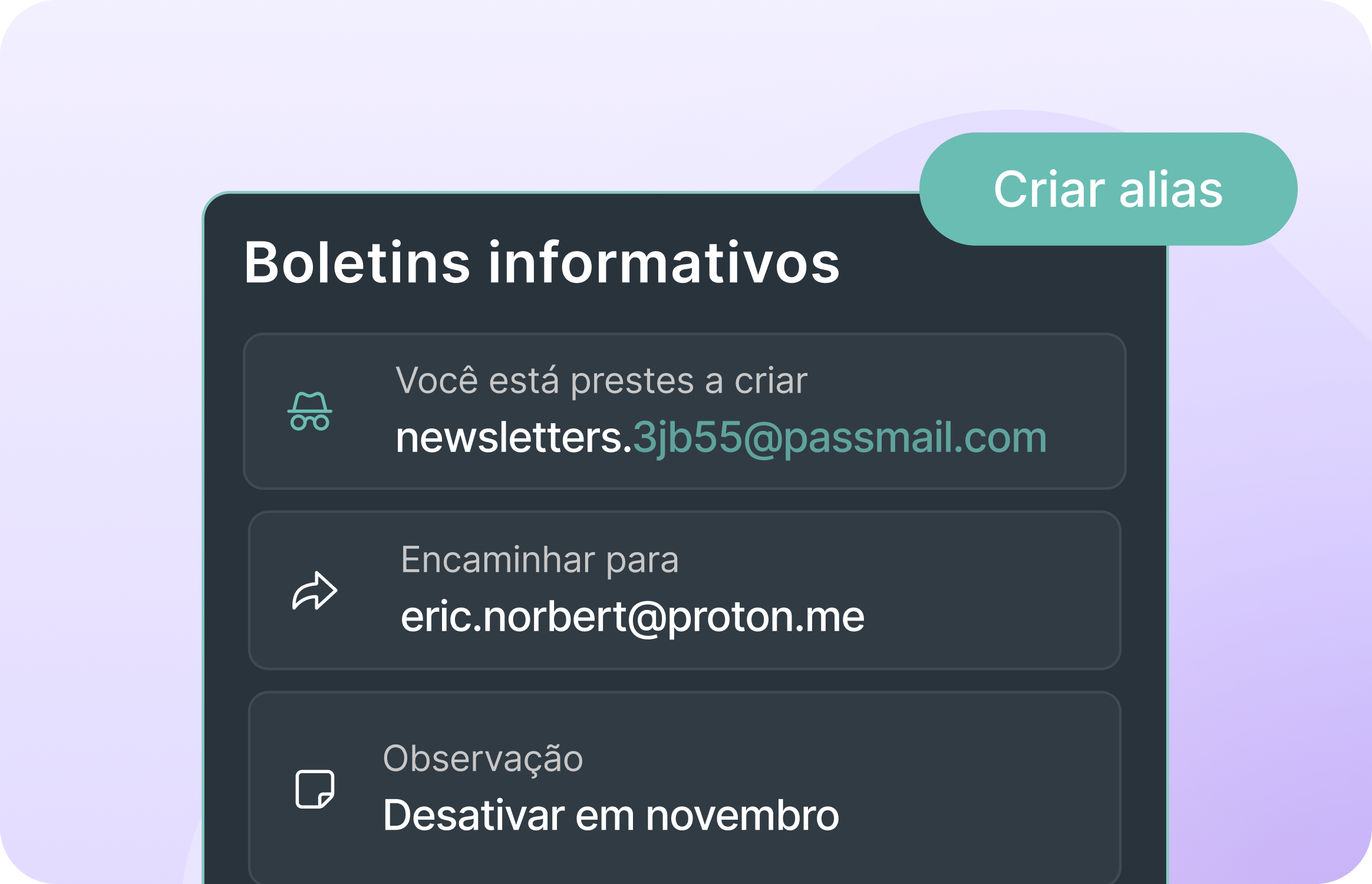 Sempre que você se inscreve em uma nova conta on-line, o Proton Pass pode criar automaticamente um alias para manter seu endereço de e-mail real protegido.
