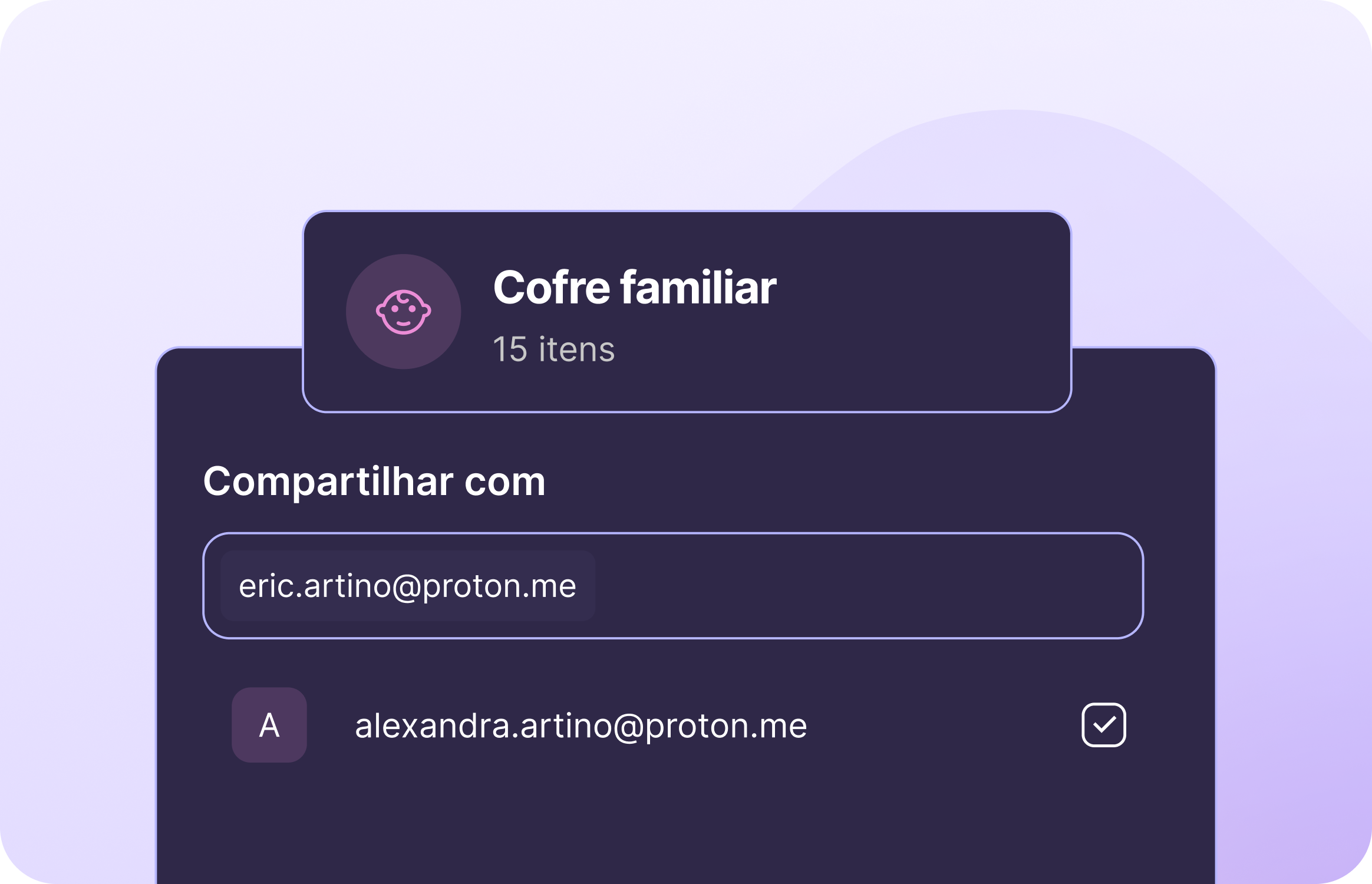 Compartilhe facilmente informações sensíveis com qualquer pessoa, mesmo que ela não use o Proton Pass. Você pode compartilhar itens individuais, como senhas, notas ou cartões de crédito, ou um cofre inteiro.