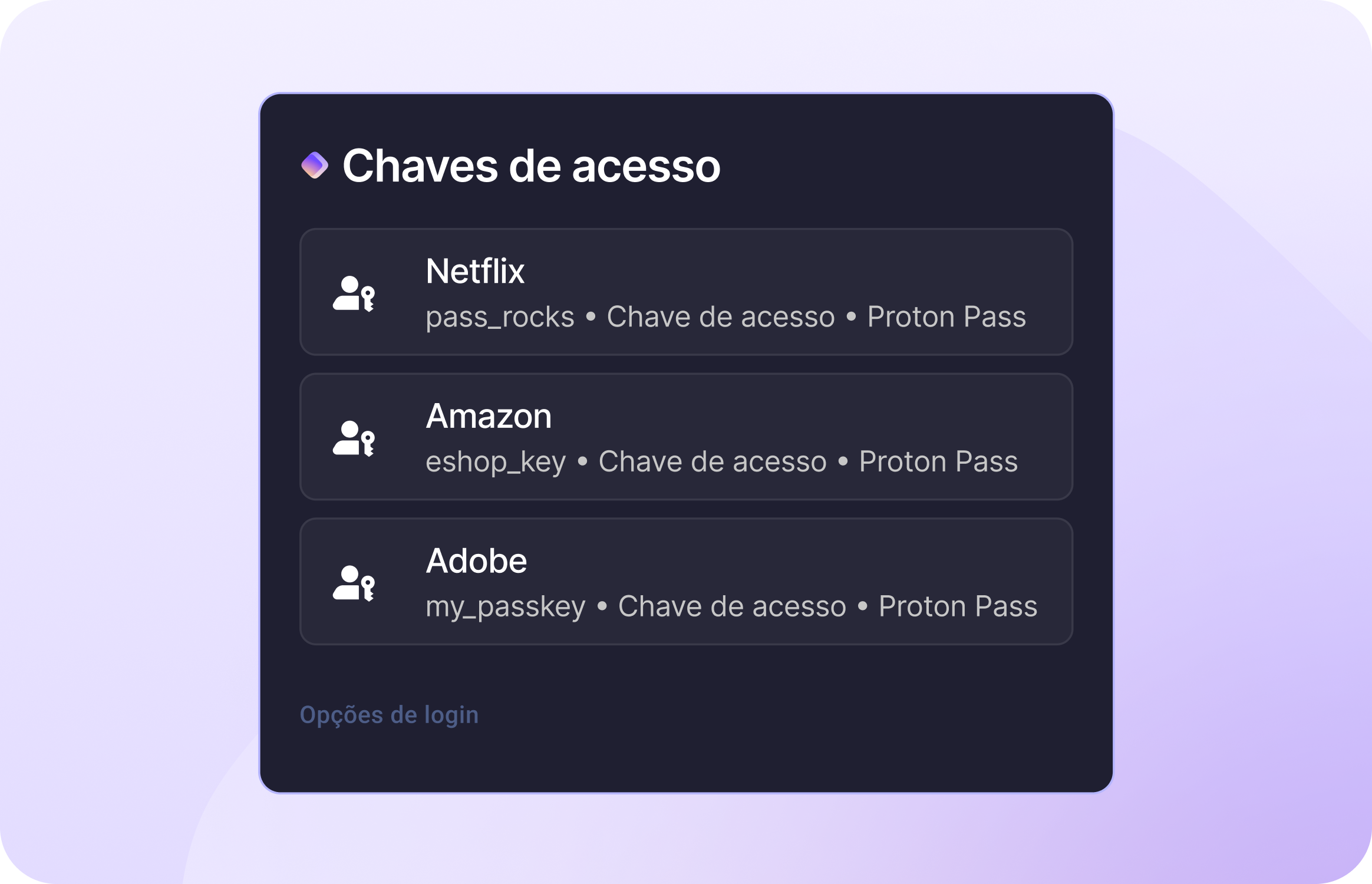 Chaves de acesso são uma alternativa fácil e segura às senhas tradicionais que impedem os ataques de phishing e deixam sua experiência on-line mais tranquila. O Proton Pass aceita chaves de acesso em todas as plataformas.