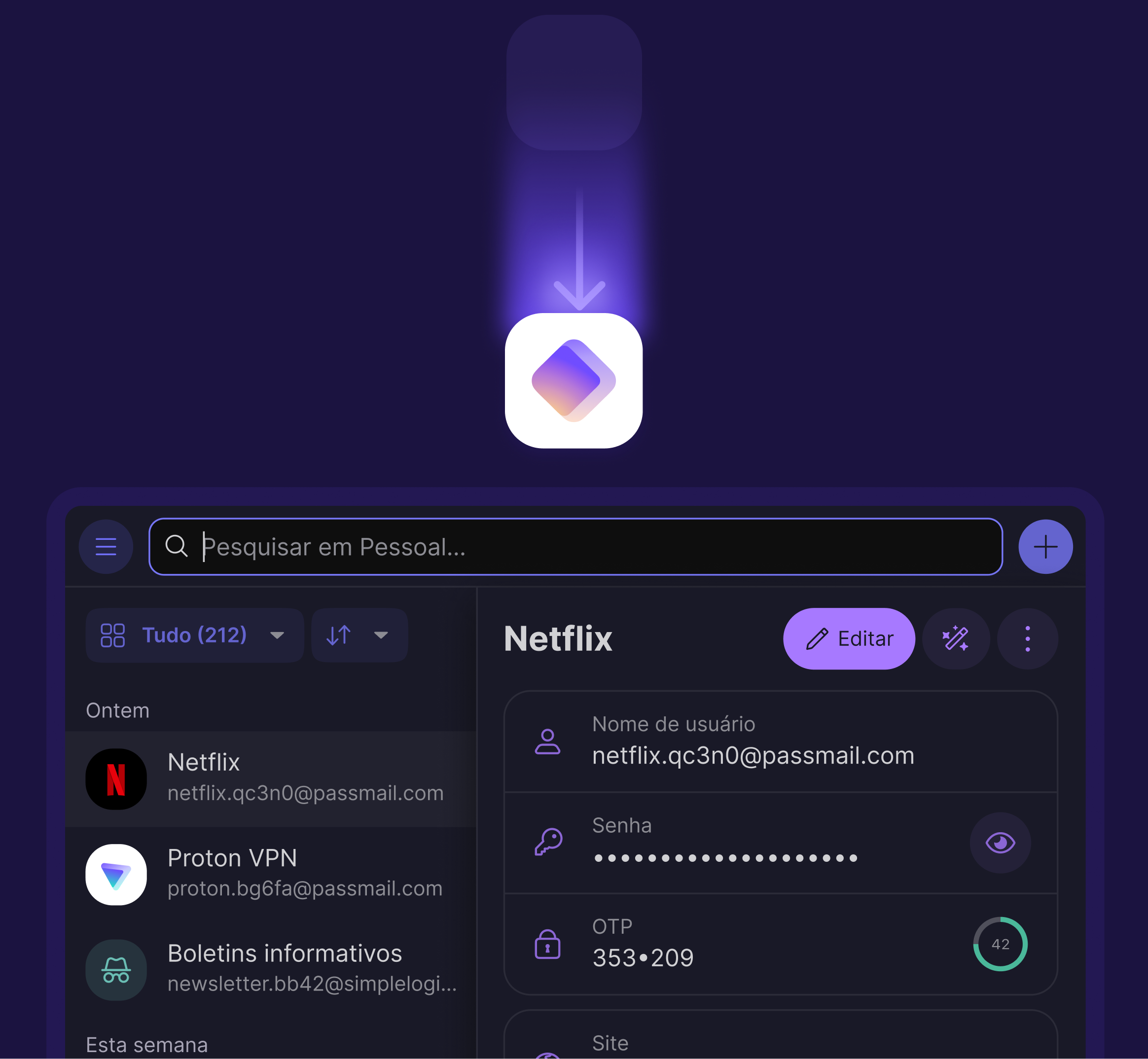 Além de armazenar seus logins, o Proton Pass protege sua identidade com um recurso integrado de alias de e-mail.