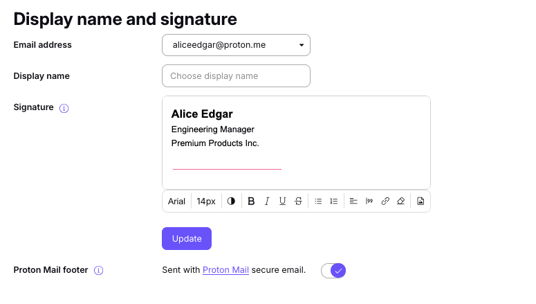2. In the Display name and signature section, enter your display name and email signature and click Update.