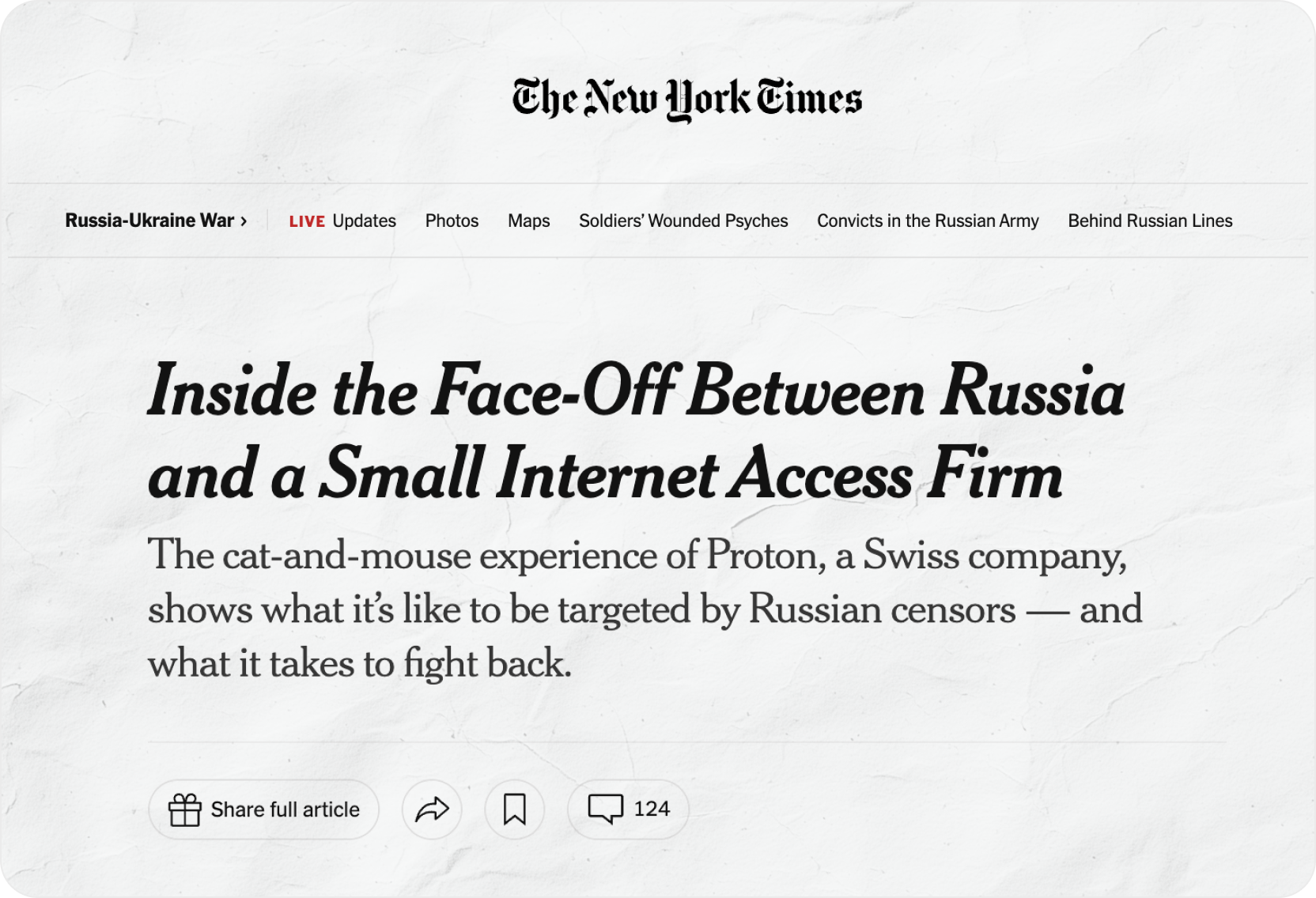 Em 2022, o nosso trabalho foi destacado num artigo de primeira página do New York Times, realçando os desafios e esforços que fazemos para contrariar a censura governamental, especialmente em países como a Rússia, e garantir que os nossos utilizadores continuam a poder aceder e partilhar informações online.