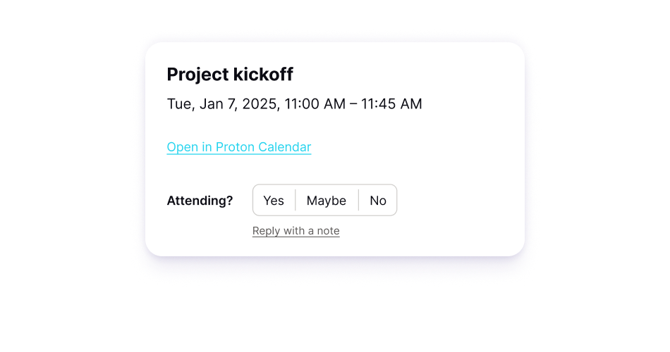 Seamlessly manage your calendar alongside your email. Send meeting invites securely via email, and add events to your calendar directly from Proton Mail.