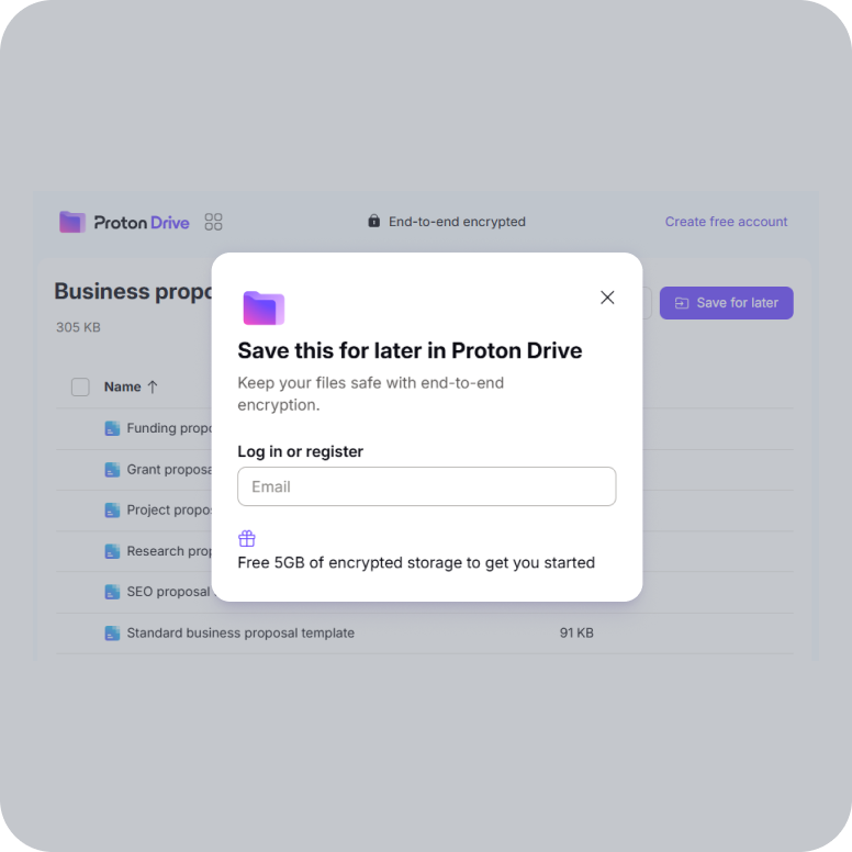 With our cloud storage for business, you can easily customize and share business proposal templates. Create a Proton Drive account and collaborate securely with your team.