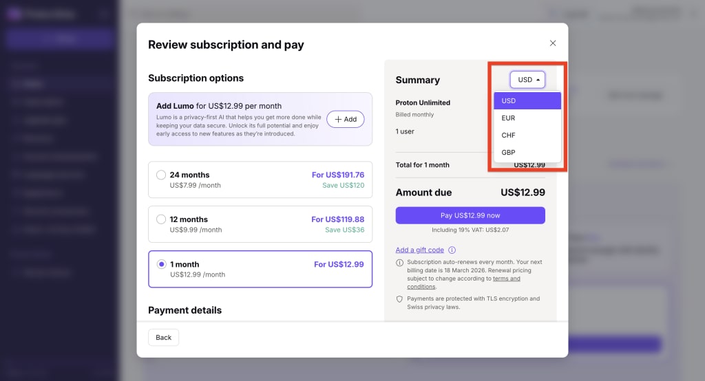 Can I change the currency for my Proton subscription?