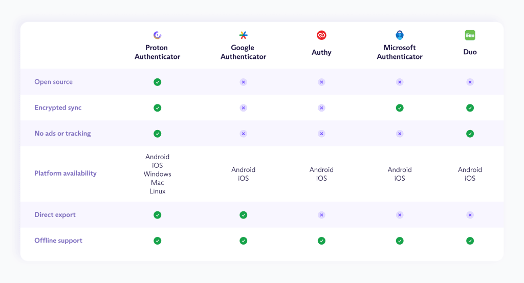 Вот как Proton Authenticator сравнивается с другими популярными приложениями 2FA: