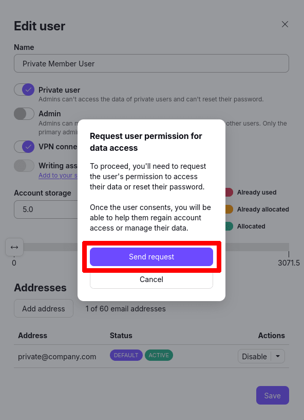 To access a private user’s data, administrators can request a private user to enable administrator access. If the user accepts, they will become non-private and the administrator will be able to access the data or reset their password.