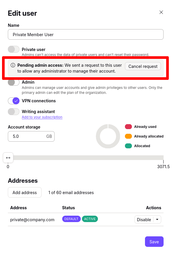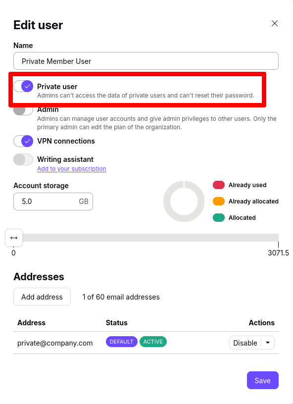 1. Sign in to your administrator Proton Account at account.proton.me and go to Settings → All settingsOrganizationUsers and addresses. Click Edit in the Action column next to the user.