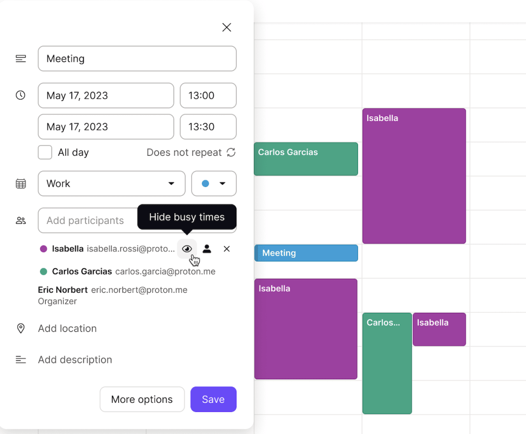 When you create a new event and add participants to it in your Proton Calendar, the availability of participants who choose to share their availability will automatically be displayed in your calendar view, allowing you to schedule an appropriate time.