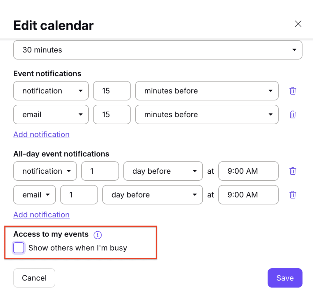 Under “Access to my events”, you can now uncheck the option to share your busy status.