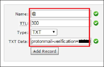 This means you must create a new DNS record in your DNS console. Select the record type TXT. Enter the character @ in the host name field. And paste the value protonmail-verification=xxx into the value field.