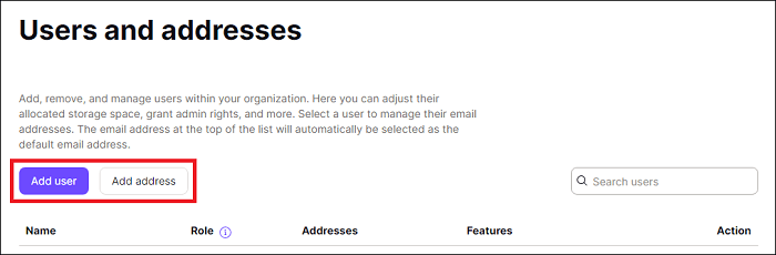 1. Click the Add user or Add address button to navigate to the Users and addresses settings page. You can also access that page by following this link: https://account.proton.me/mail/users-addresses