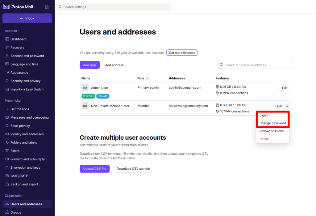 1. Log in to your administrator Proton Account at account.proton.me and click Settings → All settings → Organization → Users and addresses.