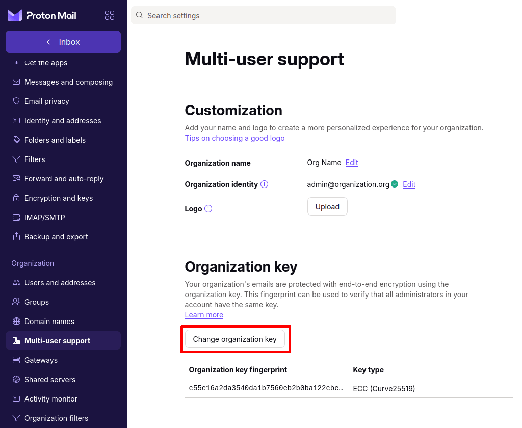 - Log in at account.proton.me and go to Settings → All settings → Organization → Multi-User Support → Organization key → Change organization keys.