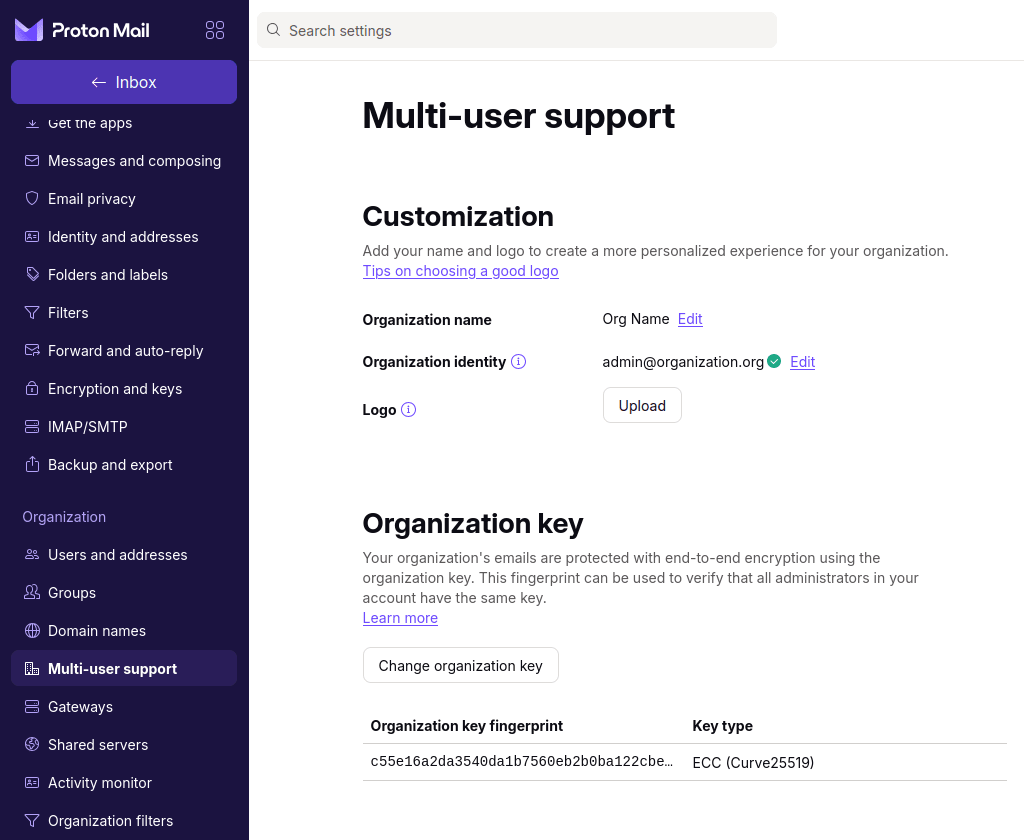 To find out details about your organization key, log in to your Proton Account at account.proton.me and go to Settings → All settings → Organization → Multi-User Support → Organization key.