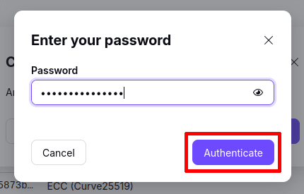 - Enter your current account password (and 2FA, if enabled), then click Authenticate