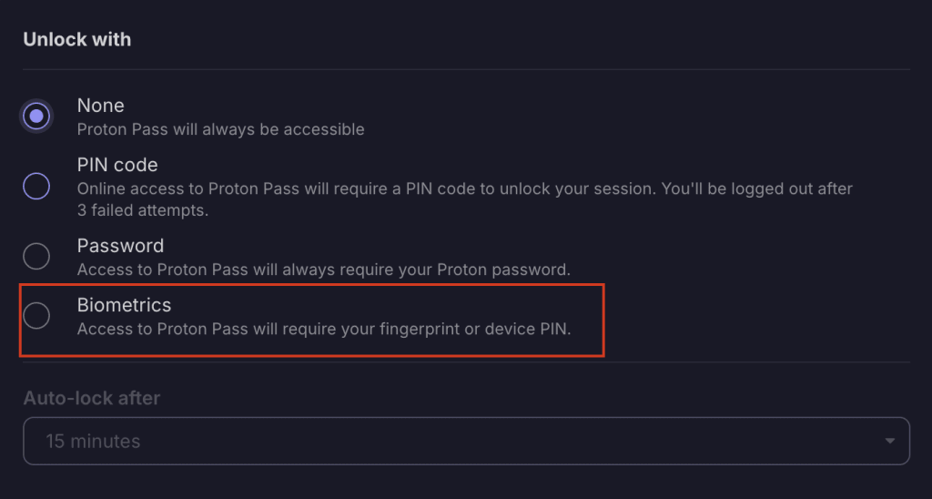 If you have a paid Proton Pass account, you can use biometric authentication to unlock Pass on Windows. Biometric authentication is available for mobile on both free and paid plans.