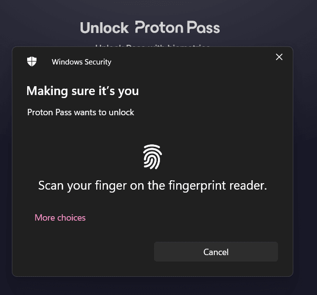 Click Unlock and use your fingerprint to log in. You’ll then be prompted to allow Proton Pass to use your fingerprint reader.
