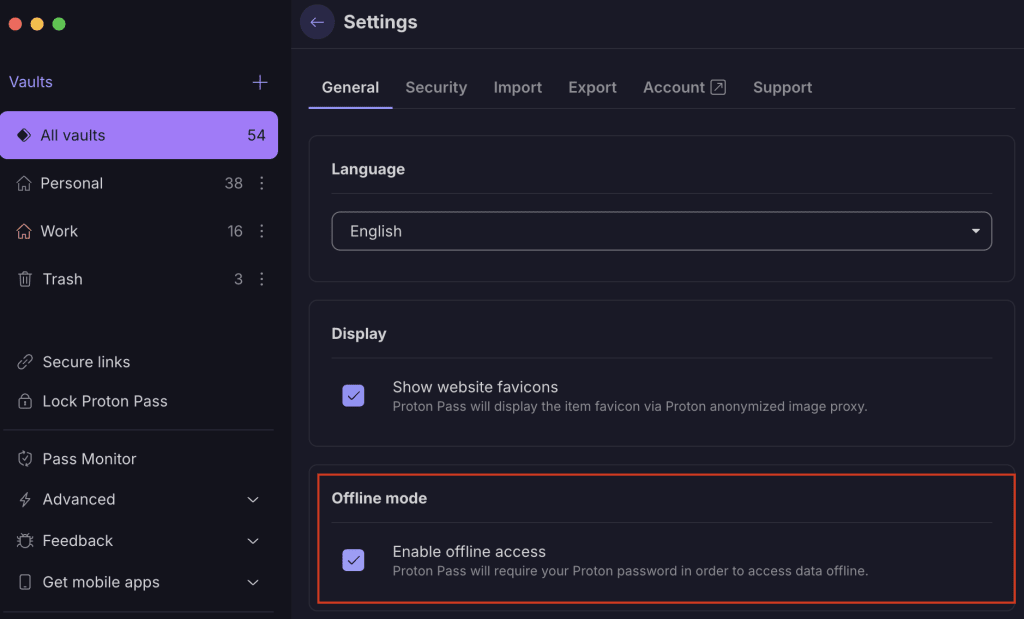 Go to the General tab → Offline mode and check the box next to Enable offline access. You’ll be asked to enter your Proton Account password. Once you’ve done that, offline access should be available.