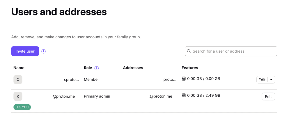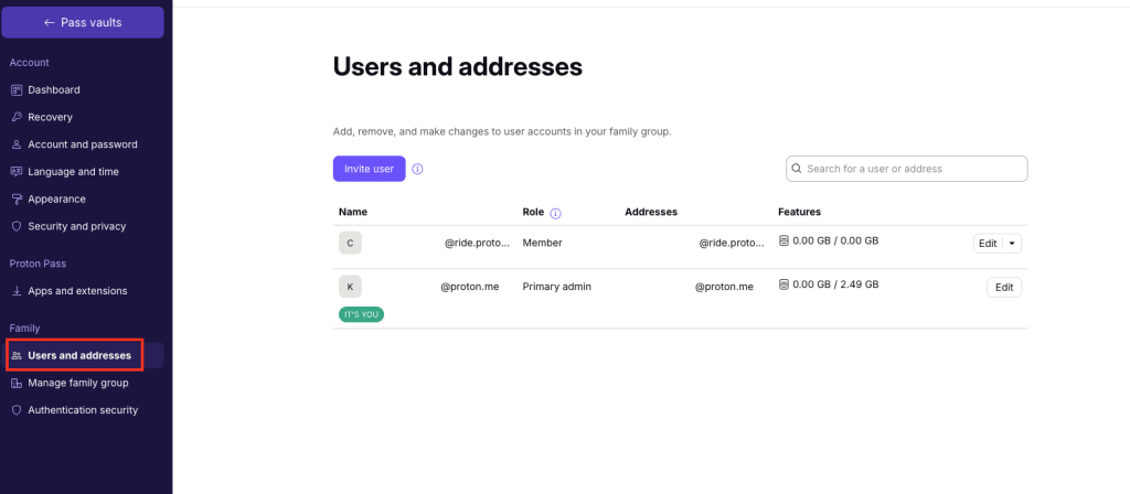 - On your dashboard, select Users and addresses. You’ll see all the invited and active users on your plan.