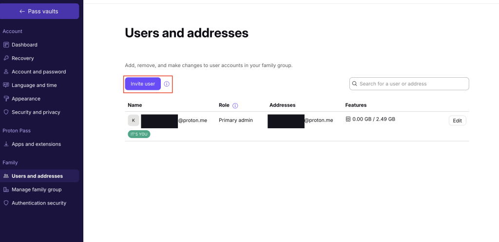 - Go to the Family → Users and addresses in the left-hand bar → select Invite user.