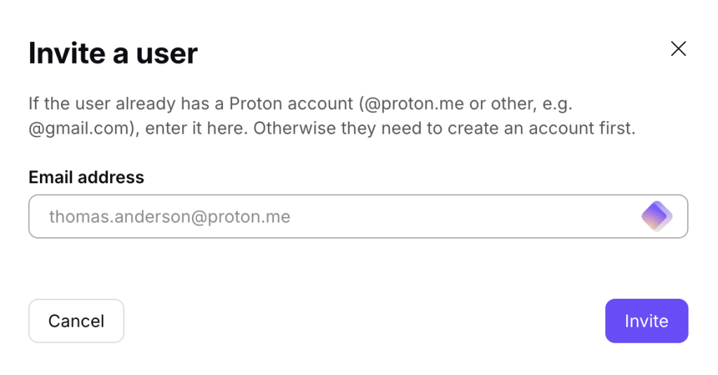 - If you’re inviting an existing Proton user, enter their email address. If you’re inviting a new user who does not yet have a Proton account, help them set up a Proton account first.