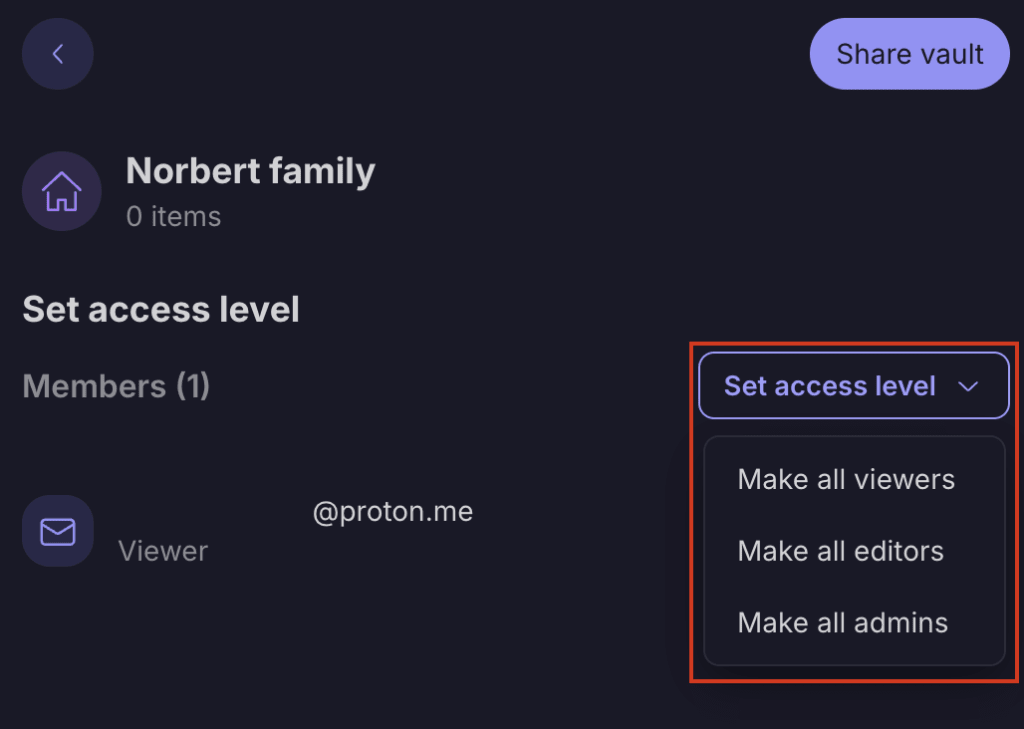 - Set their access level — They can view or edit passwords or be an admin for the vault.