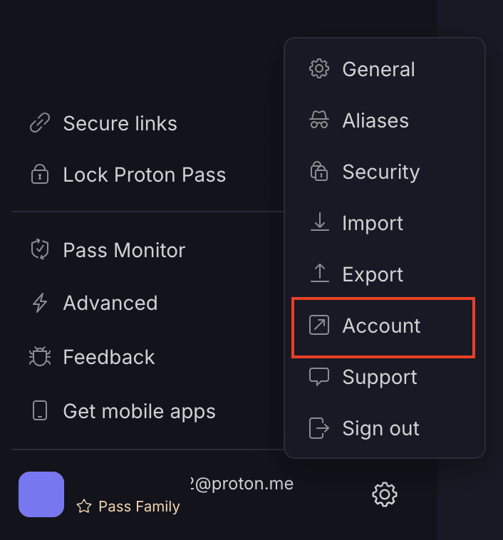 Log in to pass.proton.me(neues Fenster), then click ⚙ Settings → Account